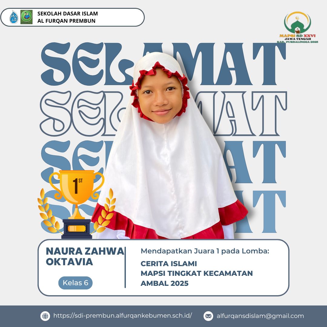 Buat mba Naura Yang telah meraih juara 1 dalam lomba cerita Islami di kecamatan Ambal, Yang merupakan delegasi SD Islam Al Furqan Prembun,
